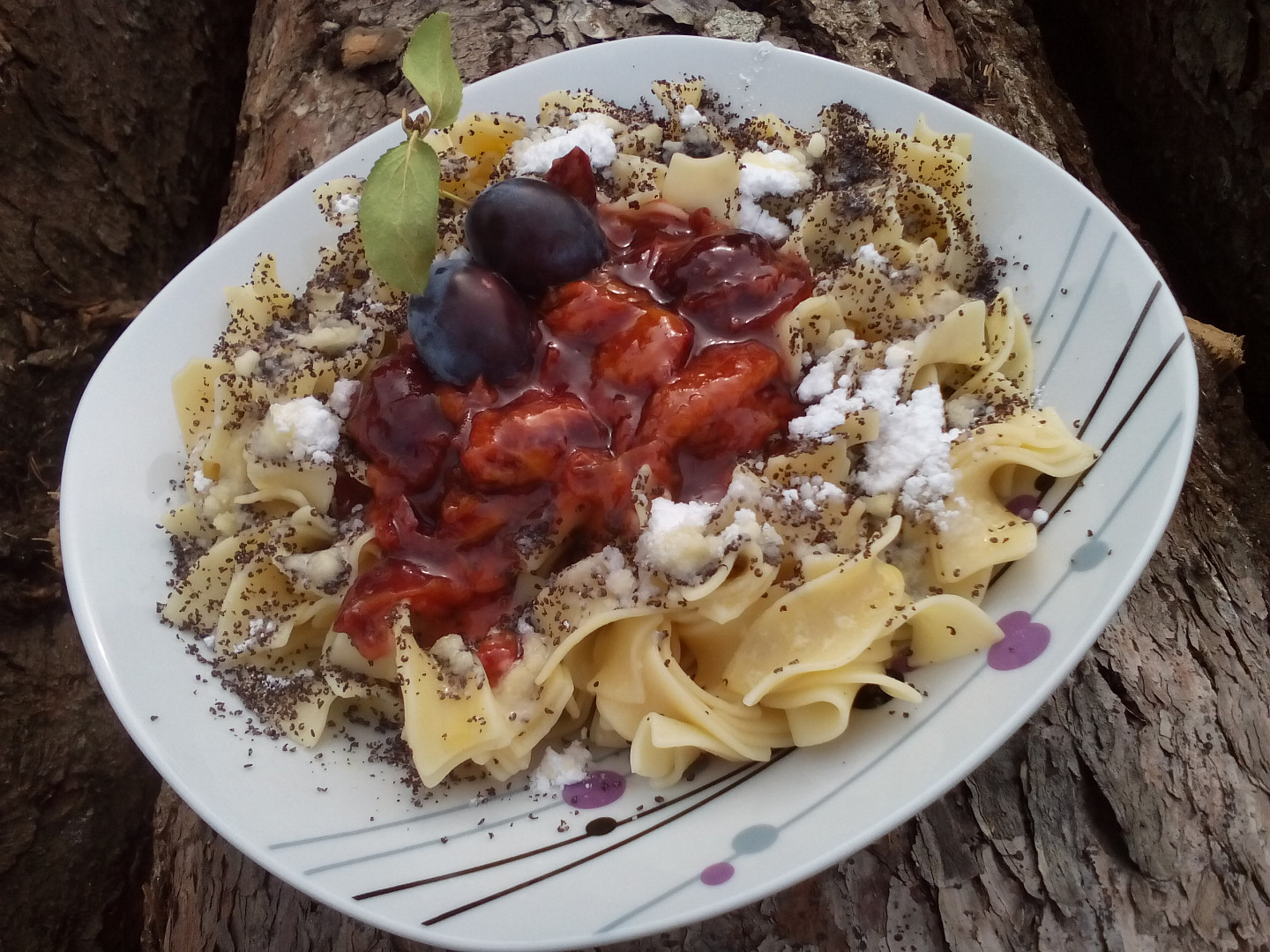 Těstoviny uvaříme dle návodu v mírně osolené vodě, scedíme, přidáme do nich kousek másla a promícháme. Těstoviny nandáme na talíř, osladíme moučkovým nebo skořicovým cukrem, jen trochu, rozvar jsme již sladili, posypeme mletým mákem , perníkem nebo tvarohem a přelijeme rozvarem.