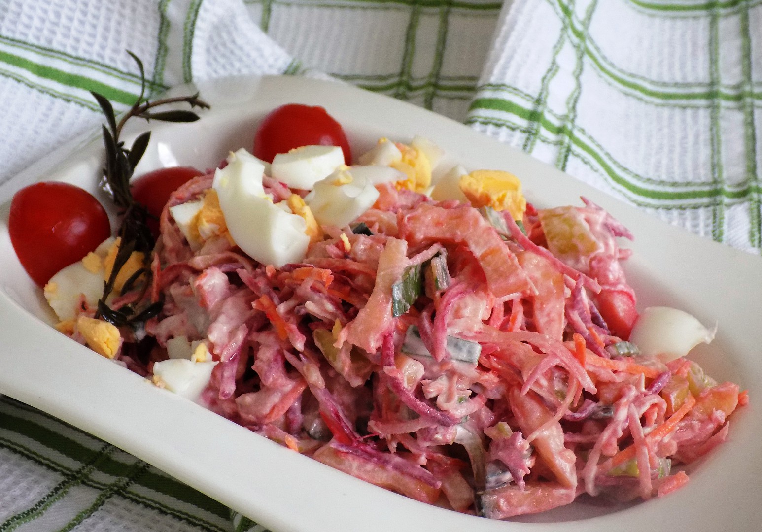 Uvařené brambory pokrájíme na kostky, dále pokrájíme pórek, papriku na kostičky, kousek salátové okurky na kostičky (možnost i 2x okurčičky sterilizované), vejce na tvrdo uvařené na kostičky, nastrouhat mrkev, celer, petržel, kousek červené řepy, na jemno nastrouhat kousek křenu (možno vynechat), majonézu smíchat se zakysanou smetanou, ochutit pepřem, solí, hořčicí.