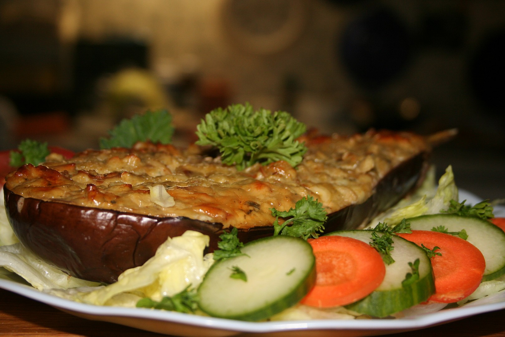 Orosený vnitřek lilků osušíme, potřeme česnekem a naplníme sýrovou směsí.