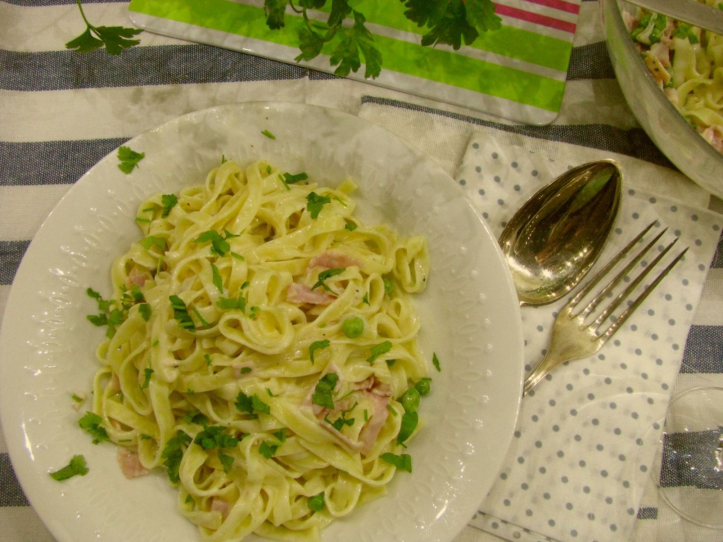 Zamiešame, prehrejeme a ochutnáme. Až teraz pridáme soľ. Tagliatelle zmiešame s omáčkou a posypeme nasekanou petržlenovou vňaťou.