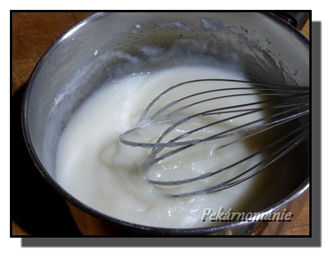 V kastrůlku metličkou rozšleháme odváženou vodu a mouku. Za stálého míchání přivedeme k teplotě 65°C (trvá to jen 2-4 minuty).