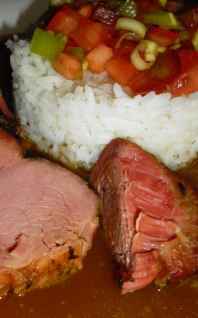 5. Naložené maso zprudka opečeme na pánvi tak, aby se zatáhlo, párátky na jeho vrchní stranu připevníme silnější plátky uzeného špeku a dáme do pekáče s poklicí nebo „ římského hrnce “ podlijeme cca 3 dcl vody a pečeme zvolna cca 90 minut.