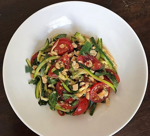 Nadrtíme pražené arašídy. Do nějaké nádoby uděláme zálivku. Smícháme sladkou chilli omáčku, rýžový ocet a rybí omáčku a zalijeme tím zeleninu, promícháme a servírujeme na talíř. Na talíři zdobíme thajskou bazalkou a posypeme arašídy.