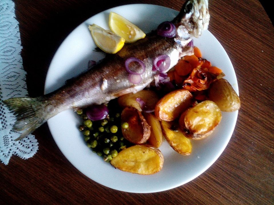 Měkkou upečenou rybu z pekáče vyndáme a do výpeku nasypeme brambory překrojené na poloviny, hrášek, mrkev a šalotky a necháme péct tak dlouho, až nám mrkev a brambory změknou a jsou opečené.