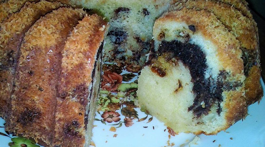 Do připravené formy dáme jednu vrstvu světlého těsta, na které naskládáme pokrájenou čokoládu tak, aby se potopila do těsta. Pak dáme vrstvu tmavého kakaového těsta a na ní opět vrstvu světlého těsta, do kterého opět dáme kousky čokolády tak, aby se kousky dostaly do těsta.