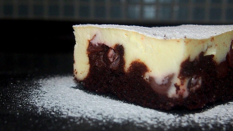 Vymažeme a vysypeme pekáček, nalijeme tmavé těsto, dáme vypeckované višně a rozprostřeme tvarohovou náplň.