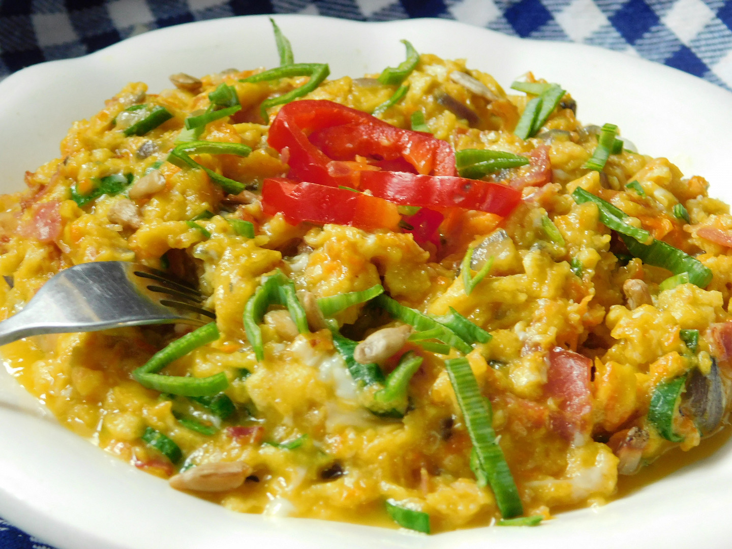 Vejce prošleháme se smetanou a vlijeme na orestovanou směs. Na mírném plameni necháme pozvolna tuhnout a přimícháme droždí. Mícháme do potřebné konzistence a dochutíme solí a pepřem.
