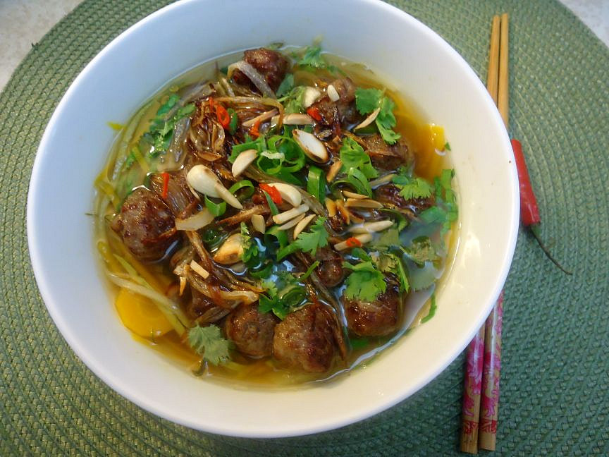 Do misky dáme mleté maso, přidáme koření, rybí omáčku a dobře promícháme. Mokrou rukou vytvoříme cca 25 polévkových knedlíčků a zatím je necháme na tácku zakryté stranou. Do rozehřáté pánve dáme sádlo a na něm usmažíme dohněda cibuli nakrájenou na jemné měsíčky. Usmaženou cibuli vyndáme stranou a na témže sádle osmažíme dozlatova masové kuličky.