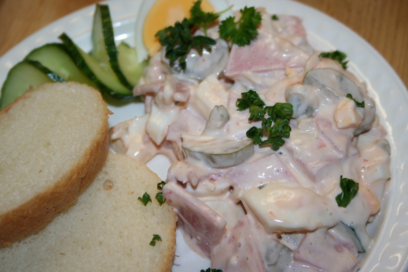 Salám nakrájíme na tenké proužky, přidáme cibuli, nadrobno nakrájenou okurku a natvrdo uvařená vajíčka. Nakonec přidáme vychladlou směs z kečupu a hořčice a majolku.