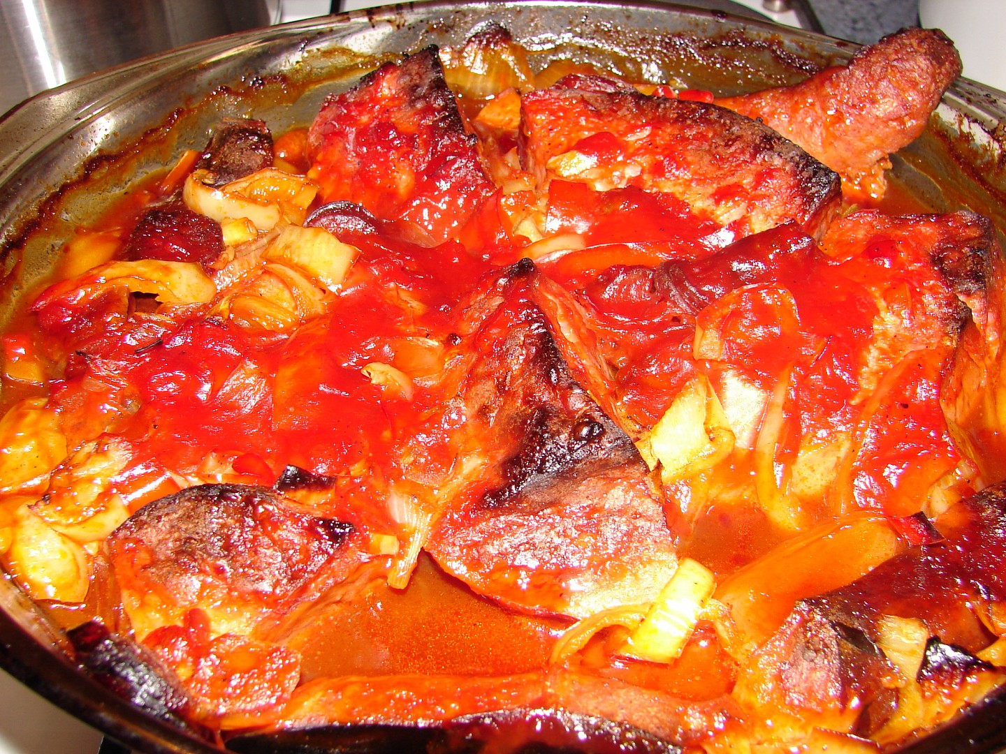 5. Dále přidáme nakrájenou papriku, česnek a feferonku. Posolíme, popepříme a zalijeme cikánskou omáčkou, kečupem a černým pivem.