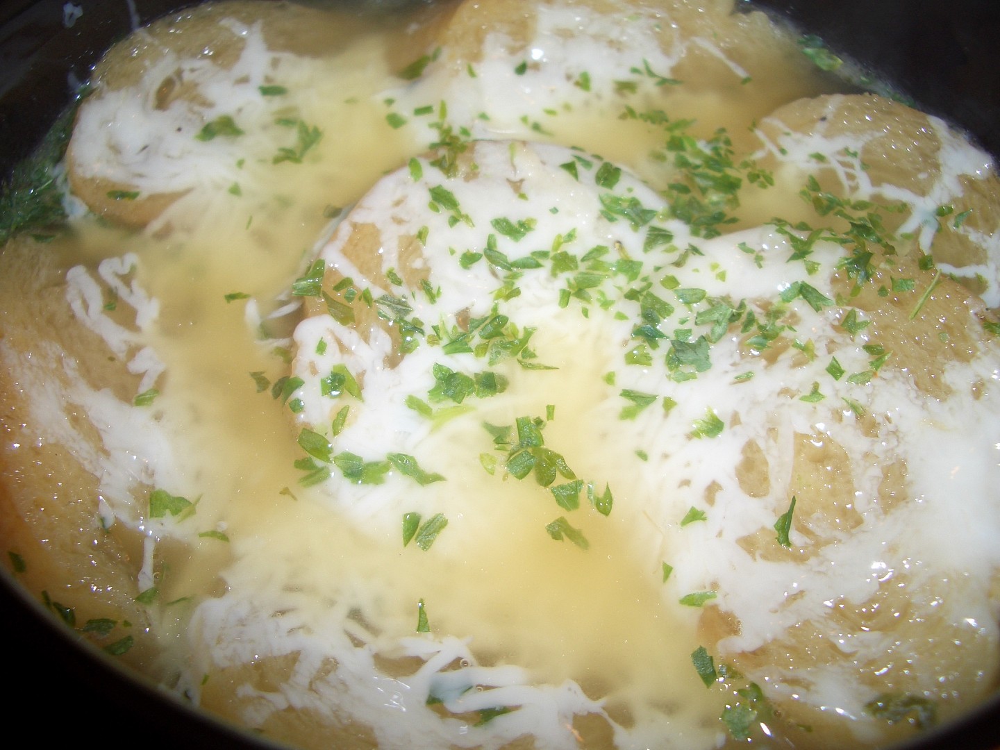 Polévku nalijte do ohnivzdorných talířů, navrch položte plátek opečeného chleba, posypte je sýrem. Dejte zapéct do trouby na 180 st. asi na 3-4 minuty. Poté servírujte.