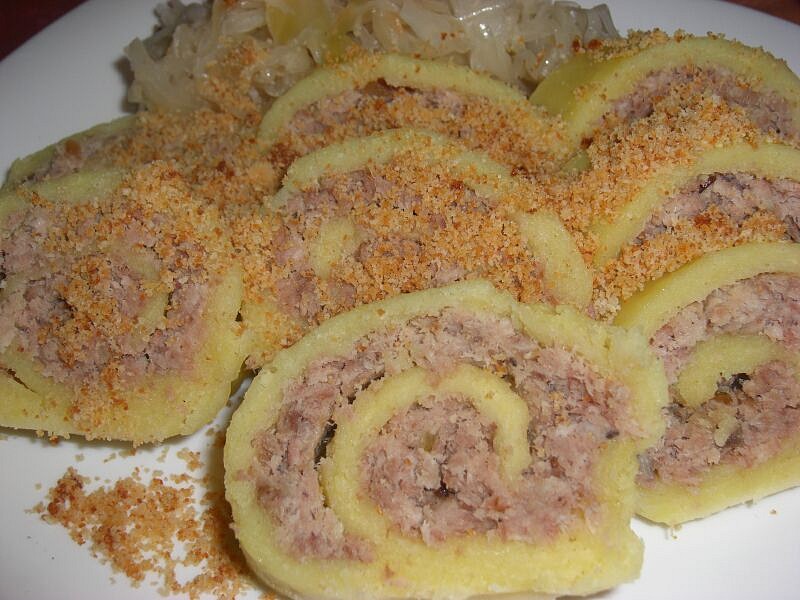 Uvařené záviny rozkrájíme nití na plátky, upravíme na talíře, posypeme opraženou strouhankou a podáváme s dušeným kysaným zelím nebo zelným salátem.