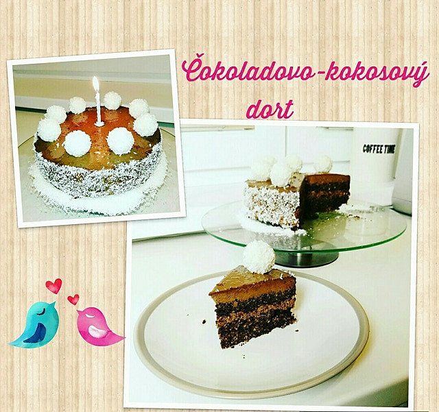 Ganache jsem nalila na vychladlý dort, boky posypala kokosem a dozdobila Raffaellem.