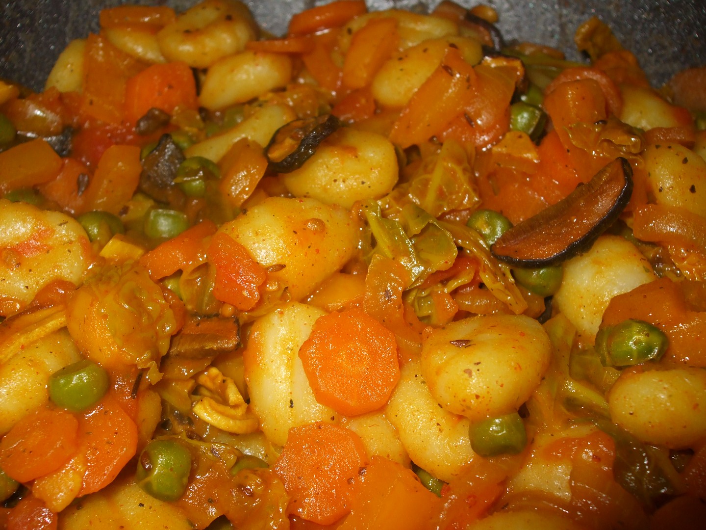 Až se voda vyvaří a rajčata se nám trochu rozvaří, aby vznikla šťáva, vmícháme uvařené gnocchi.
