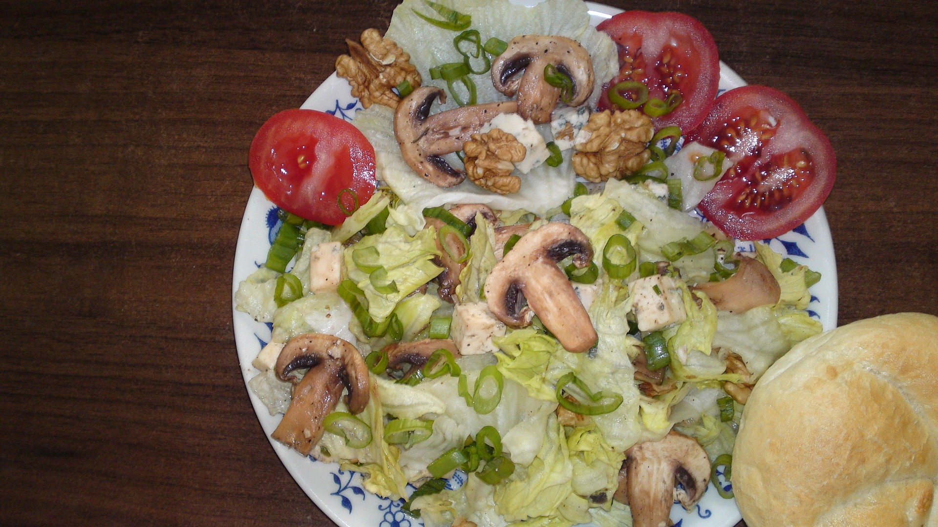 Pridáme orechy, syr, cibuľovú vňať, marinované šampiony a dôkladne všetko premiešame.
