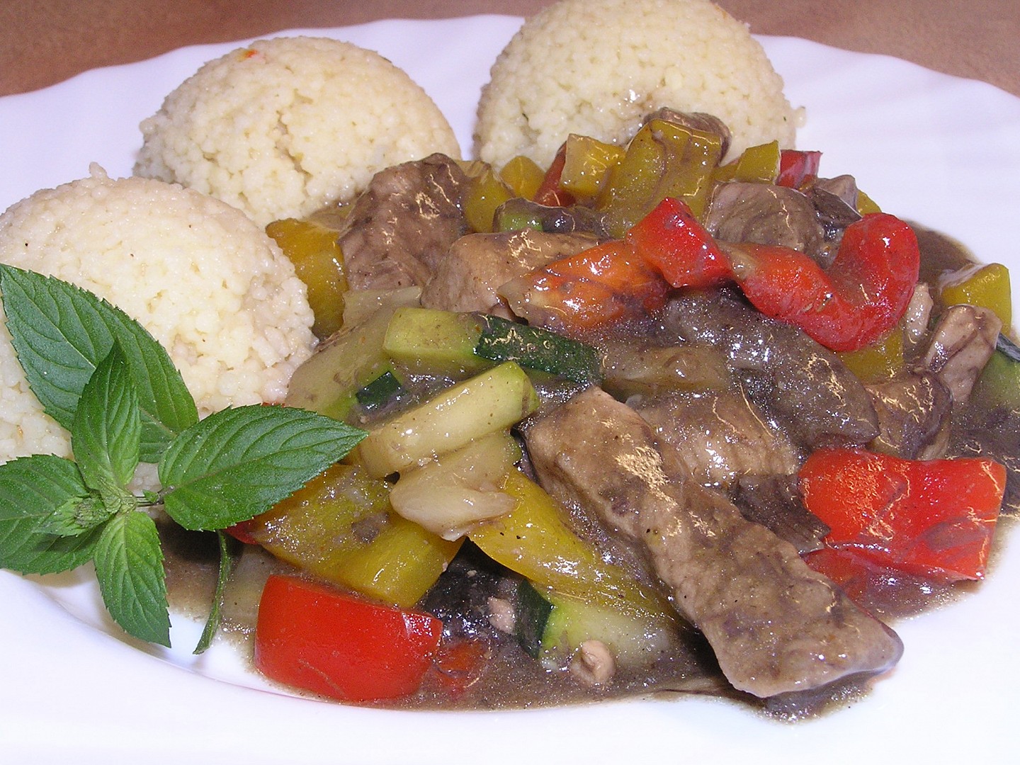 Až je maso hotové, necháme tekutinu zredukovat na minimum, přidáme nakrájené papriky a cuketu, 5 minut restujeme, zalejeme 200ml vývaru, přivedeme k varu, zahustíme 1kl solamylu rozmíchanou ve vodě. Povaříme ještě 1 minutu, přidáme sójovou omáčku a můžeme podávat.